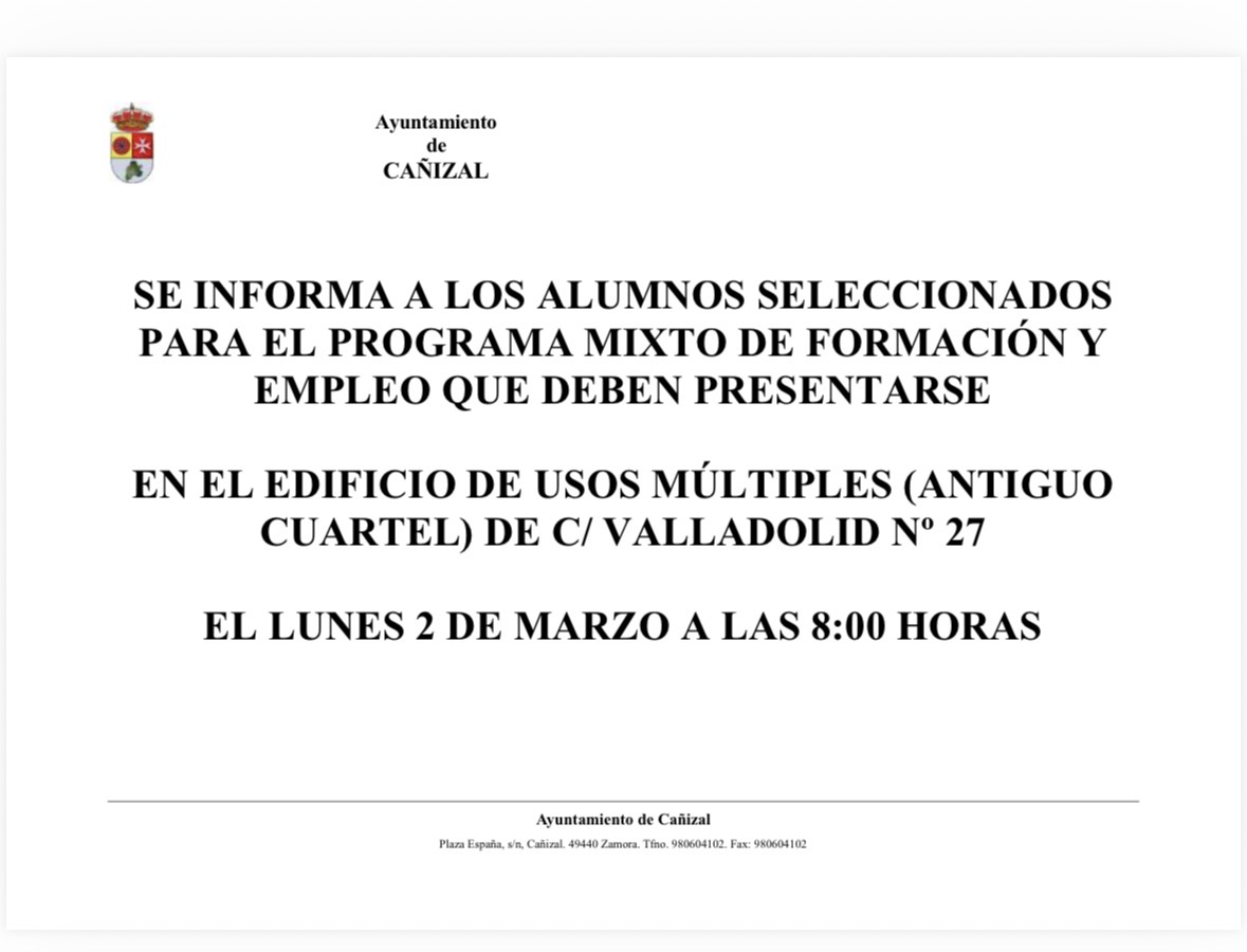 ❗️Toda persona interesado en participar como alumnos en el Programa Mixto de Formación y Empleo del Ayuntamiento de Cañizal, en la modalidad de albañilería, que se pasa el lunes día 2 de febrero por el Ayuntamiento, en horario de mañana, para rellenar el impreso correspondiente. Podrán acudir directamente a la oficina de empleo de Toro si así lo prefieren. ❗️ -
