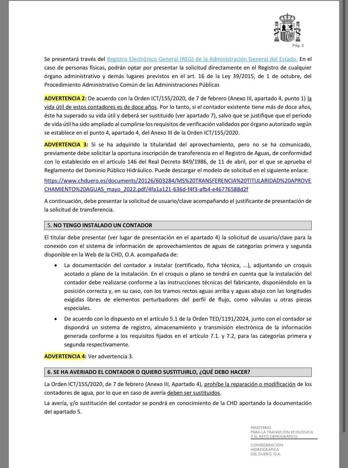 Hoja informática de la nueva normativa reguladora de los sistemas electrónicos de control de los volúmenes de agua utilizados por los aprovechamientos de agua de categoría de primera y segunda .