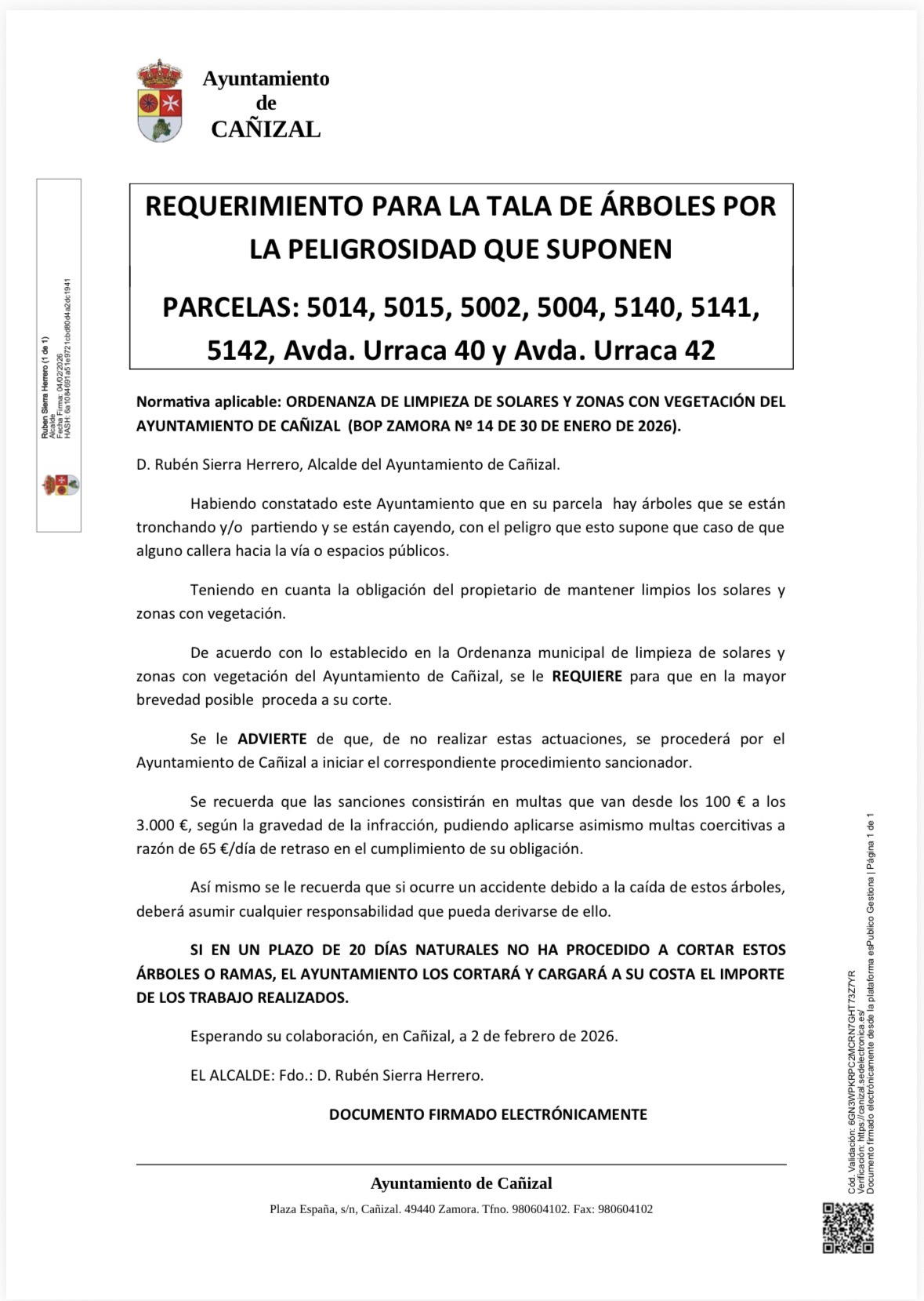 Se le ADVIERTE de que, de no realizar estas actuaciones, se procederá por el Ayuntamiento de Cañizal a iniciar el correspondiente procedimiento sancionador.