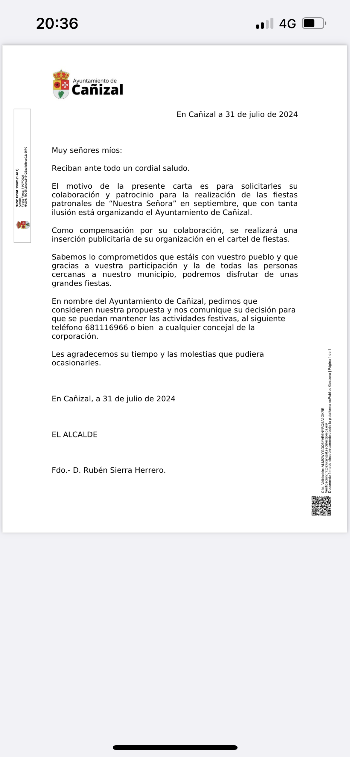 Para compensar la colaboración se realizará una inserción publicitaria en el cartel de las fiestas.En nombre del Ayuntamiento de Cañizal, pedimos que considere nuestra propuesta y se pongan en contacto al siguiente número de teléfono 681 11 69 66 o con el Alcalde o cualquier concejal para comunicar su decisión antes del Domingo, 11 de Agosto.