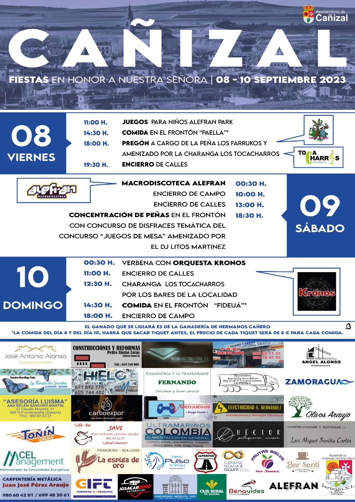 Fiestas en honor a nuestra señora de septiembre2023-08-23 19:58:26Info GeneralDesde el Ayuntamiento de Cañizal queremos compartir con todos vosotros el cartel de las Fiestas en honor a Nuestra Señora de septiembre. Esperamos que deseéis estos días con tanta ilusión cómo nosotros.