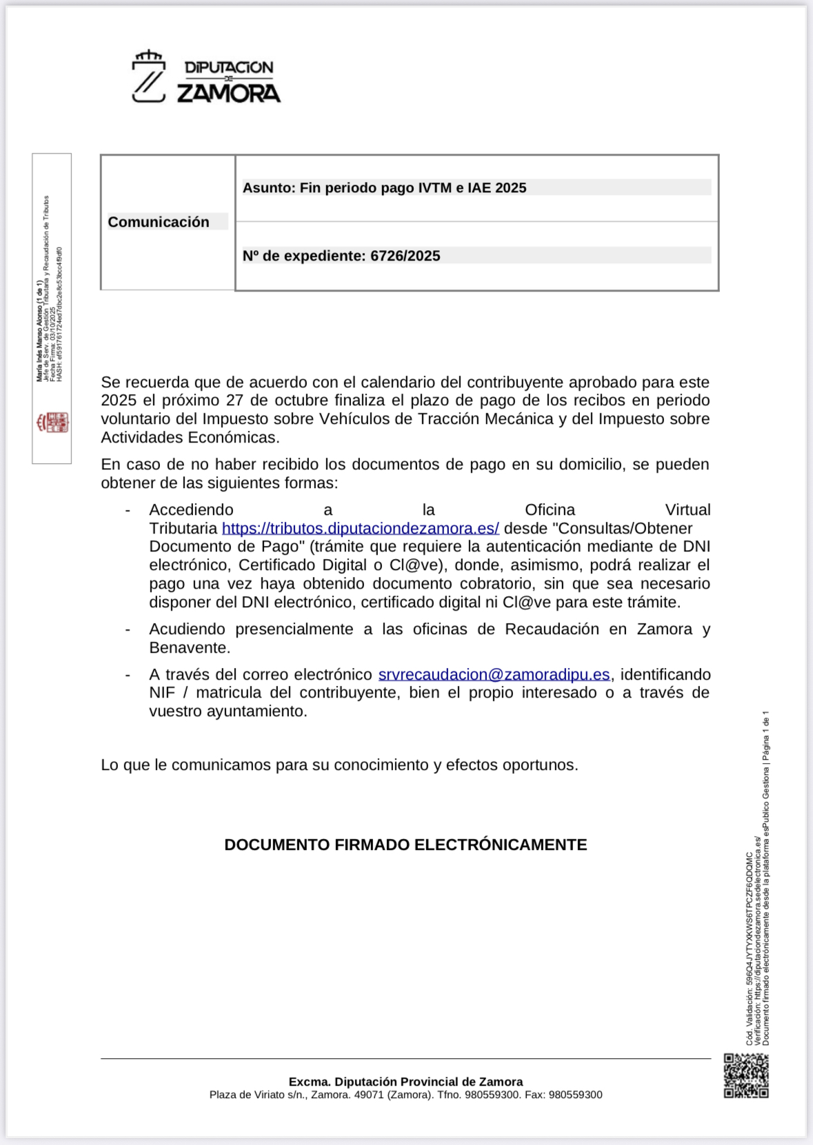 - Oficina virtual tributaria: https://tributos.diputaciondezamora.es/